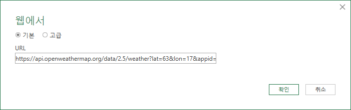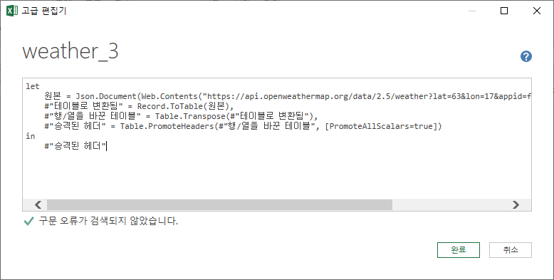 (lat as text, lon as text)=> let 원본 = Json.Document(Web.Contents("https://api.openweathermap.org/data/2.5/weather?lat="&lat&"&lon="&lon&"&appid=API_Key")), #"테이블로 변환됨" = Record.ToTable(원본), #"행/열을 바꾼 테이블" = Table.Transpose(#"테이블로 변환됨"), #"승격된 헤더" = Table.PromoteHeaders(#"행/열을 바꾼 테이블", [PromoteAllScalars=true]), #"변경된 유형" = Table.TransformColumnTypes(#"승격된 헤더",{{"coord", type any}, {"weather", type any}, ... , }) in #"변경된 유형" |